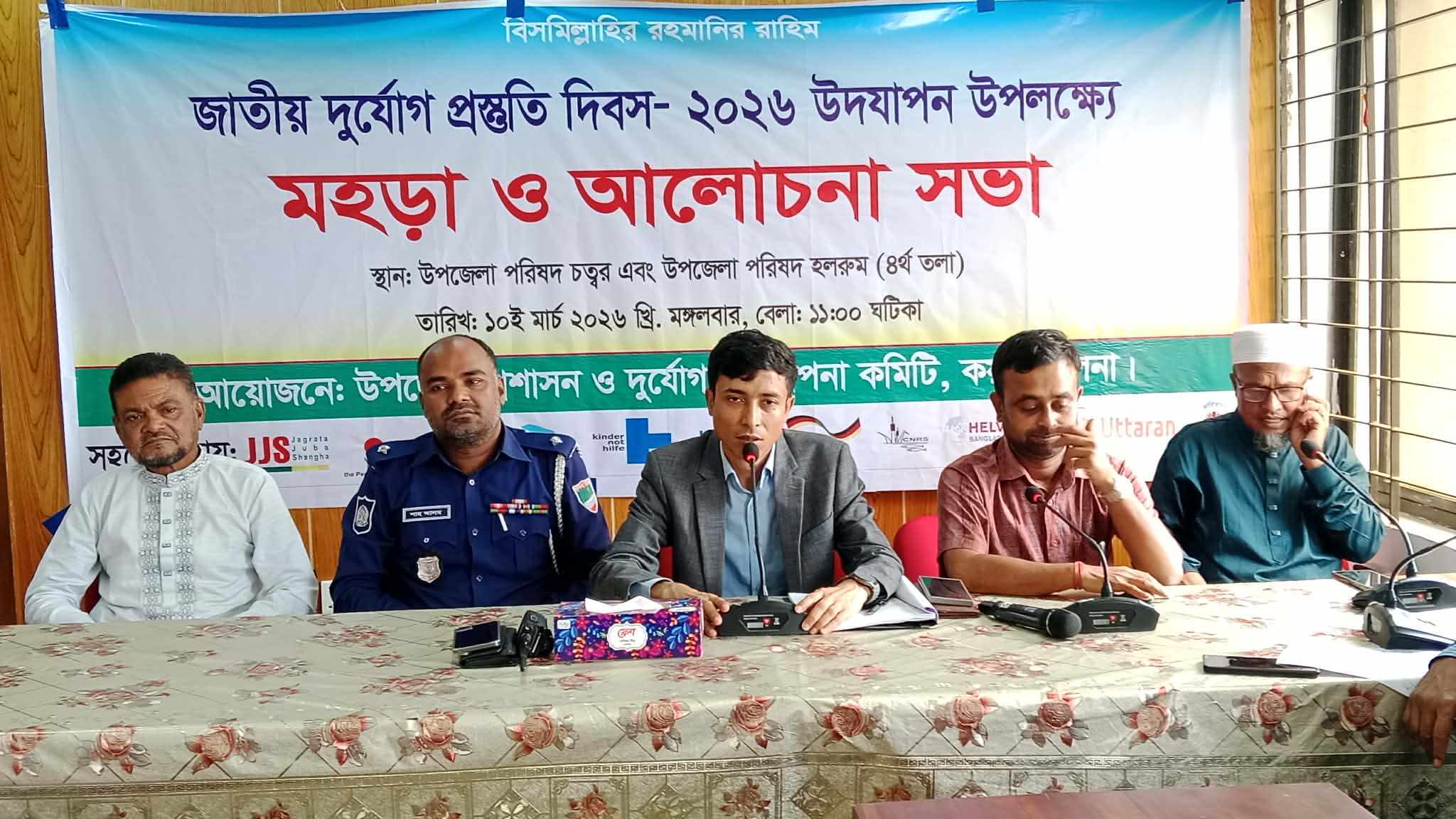 কয়রা(খুলনা) প্রতিনিধি - কয়রা উপজেলা প্রশাসন ও দুর্যােগ ব্যবস্থা কমিটির আয়ােজনে জাতীয় দুর্যােগ প্রস্তুতি দিবস উদযাপন উপলক্ষে মহড়া ও আলােচনা সভা ১০ মার্চ বেলা ১১ টায় মহড়া শেষে উপজেলা পরিষদ সম্মেলন কক্ষে অনুষ্টিত হয়। উপজেলা নির্বাহী অফিসার আব্দুল্যাহ আল বাকীর সভাপতিত্বে আলােচনা সভায় স্বাগত বক্তৃতা করেন প্রকল্প বাস্তবায়ন অফিসার আব্দুল্যাহ আল জাবির। উপজেলা মাধ্যমিক শিক্ষা অফিসার আবুল কালাম আজাদের সঞ্চলনায় আলােচনা সভায় বক্তৃতা করেন থানা অফিসার ইনচার্জ (ওসি)তদন্ত শাহ আলম, জামায়াতের আমির মাওলানা মিজানুর রহমান, বিএনপির সাবেক সদস্য সচিব নুরুল আমিন বাবুল, জেলা বিএনপির সদস্য এমএ হাসান,মুক্তিযােদ্ধা সংসদের আহবায়ক জিএম মাওলা বকস,,কয়রা উপজেলা প্রেসক্লাবের সভাপতি শরিফুল আলম, জামায়াতের সেক্রেটারী মাওলানা শেখ সাইফুল্যাহ, কৃষি অফিসার সমীর কুমার সরকার,প্রানী সম্পদ অফিসার ডাক্তার শুভ বিশ্বাস, আানসার ভিডিপি অফিসার আমিনা, কয়রা প্রেসক্লাবের সেক্রেটারী কামাল হােসেন, শিক্ষার্থী মনিরা খাতুন প্রমুখ। অুষ্ঠানে সরকারী কর্মকর্তা,ফায়ার সার্ভিসের কর্মকর্তা,মুক্তিযােদ্ধা,সাংবাদিক,এনজিও প্রতিনিধি ও সুশিল সমাজের প্রতিনিধিরা উপস্থিত ছিলেন।