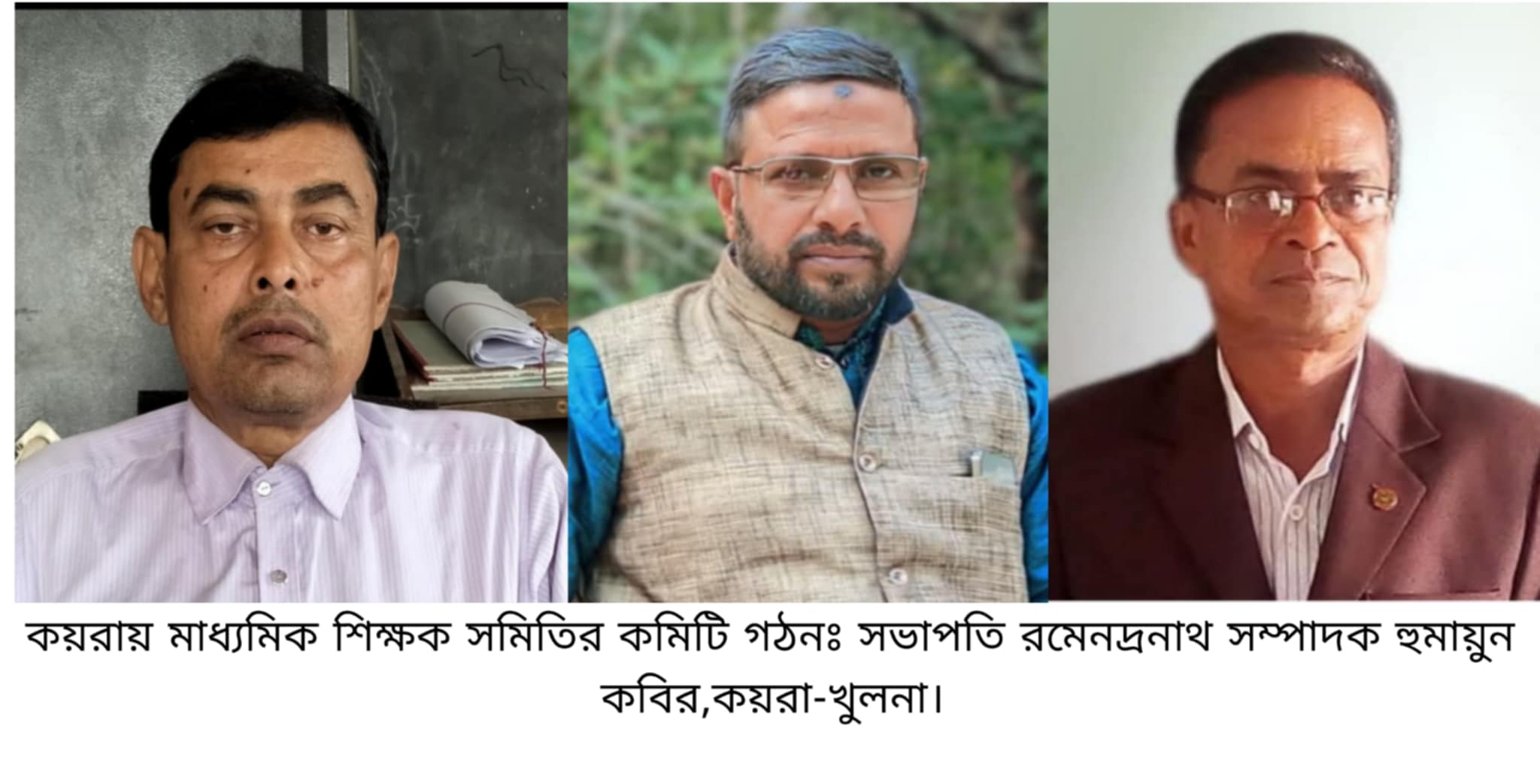 কয়রা(খুলনা) প্রতিনিধি ঃ খুলনার কয়রায় মাধ্যমিক শিক্ষক সমিতির কমিটি গঠন করা হয়েছে। এতে কপোতাক্ষ মাধ্যমিক বিদ্যলয়ের প্রধান শিক্ষক রমেনদ্রনাথ রায়,কে সভাপতি ও বড়বাড়ি মাধ্যমিক বিদ্যলয়ের প্রধান শিক্ষক মোহাঃ হুমায়ুন কবির,কে সাধারণ সম্পাদক নির্বাচিত করা হয়েছে।