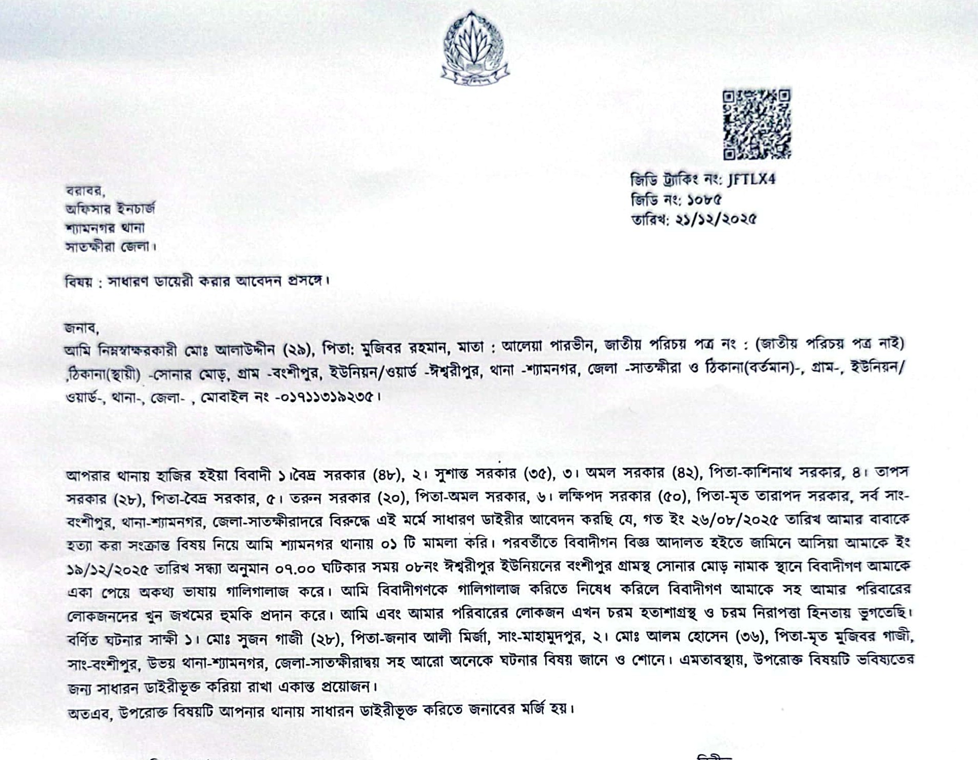 শ্যামনগর থানার অফিসার ইনচার্জ মোঃ খালেদুর রহমান জানান সাধারণ একটি ডায়েরী করেছেন মোঃ আলাউদ্দীন। বিষয়টি তারা খতিয়ে দেখছেন। বাদিকে হুমকির মত কোন ঘটনার সত্যতা মিললে পরবর্তী আইনগত ব্যবস্থা নেয়া হবে।