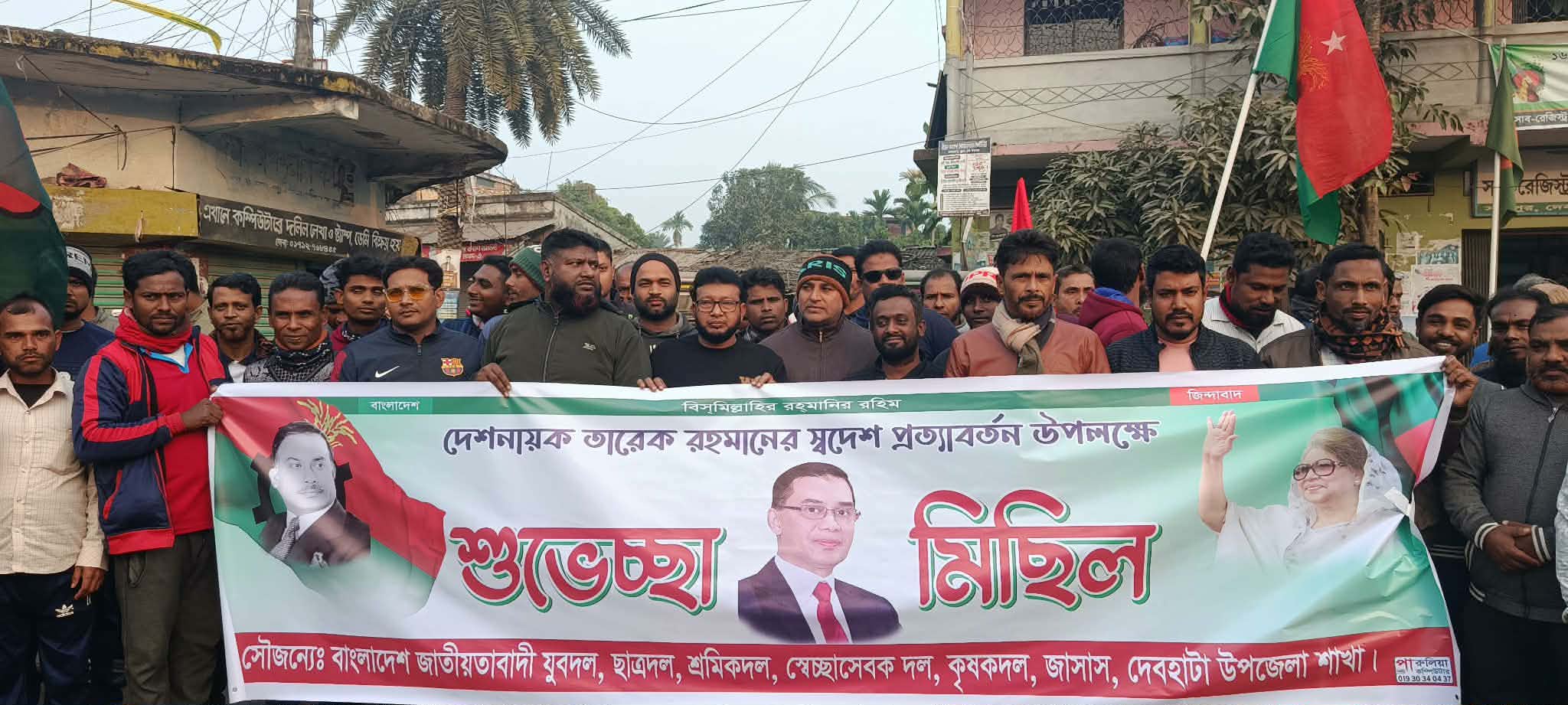 বিএনপির ভারপ্রাপ্ত চেয়ারম্যান তারেক রহমানের স্বদেশ প্রত্যাবর্তনকে স্বাগত জানিয়ে আনন্দ মিছিল করেছে দেবহাটা উপজেলা যুবদল, ছাত্রদল, শ্রমীকদল,কৃষকদল তাঁতিদল ও উপজেলা জাসাদ। ২১ ডিসেম্বর, ২০২৫ রবিবার বিকেলে সখিপুর বাজার থেকে মিছিলটি বের হয়। মিছিলটি প্রধান প্রধান সড়ক প্রদক্ষিণ করে কৃষি ব্যাংকের সামনে এসে শেষ হয়। এই সময় উপস্থিত ছিলেন যুবদলের আহবায়ক কামরুজ্জামান কামরুল, সদস্য সচিব মেহেদী হাসান সবুজ, ছাত্র দলের সদস্য সচিব ফিরোজ হোসেন তুহিন, শ্রমীক দল নেতা মোখলেছুর রহমান, আসাদুল ইসলাম, আবু সাইদ, কৃষক দলের আহবায়ক শফিকুল ইসলাম, উপজেলা জাসাস এর আহবায়ক মনিরুজ্জামান মনি, উপজেলা তাঁতি দলের আহবায়ক হিরোন মন্ডল, সরকারি কেবিএ কলেজ ছাত্রদলের সভাপতি ইমরান হোসেন,পারুলিয়া ইউনিয়ন যুবদলের আহবায়ক গোলাম রসুল,সধারণ সম্পাদক শাহীন আলম, সখিপুর ইউনিয়ন যুবদলের আহবায়ক আশরাফুল ইসলাম, সদস্য সচিব সোহাগ হোসেন, দেবহাটা সদর ইউনিয়ন যুবদলের আহবায়ক নাজমুল হুদা বাপ্পী ,সদস্য সচিব আব্দুল্লাহ আল মামুন, নওয়াপাড়া ইউনিয়ন যুবদলের আহবায়ক বাদশা, সদস্য সচিব কবির হোসন,কেবিএ কলেজ ছাত্র দলের সাবেক আহবায়ক নাজমুল হুদা রুন্টি,সদস্য সচিব শিমুল হোসেন সহ বিভিন্ন পর্যায়ের নেতৃ বিন্দু উপস্থিত ছিলেন। মিছিলে তারেক রহমানকে দেশে স্বাগত জানিয়ে নানা শ্লোগান দেন নেতাকর্মীরা।আনন্দ মিছিল শেষে সংক্ষিপ্ত সমাবেশে বক্তারা বলেন, তারেক রহমানের আগমনের প্রত্যাশায় অধীর আগ্রহে বসে আছে বাংলার মানুষ। তিনি একমাত্র ব্যক্তি যিনি দেশের মানুষের গণতান্ত্রিক ভোটার অধিকার বাস্তবায়নের লক্ষ্যে দীর্ঘ দেড় যোগ ধরে সংগ্রামের নেতৃত্ব দিয়ে আসছেন। তার নেতৃত্বে আগামীর বাংলাদেশ এগিয়ে যাবে।