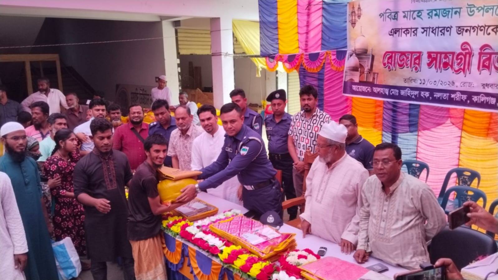 মানুষ মানুষের জন্য জীবন জীবনের জন্য, একটু সহানুভূতি কি মানুষ পেতে পারেনা? পঁয়ত্রিশ বছর পারিবারিক ঐতিহ্য ধরে রেখেছেন সাতক্ষীরার নলতার আলহাজ্ব মোঃ জাহিদুল হক। তার পরিবার এলাকার জনসাধারণ, এতিম, প্রতিবন্ধী ও দুস্থদের মাঝে বিভিন্ন সময়ে কখনো শীত বস্ত্র, কখনো আর্থিক সহযোগিতা আবার কখনো ঈদের পোশাক, ইফতার সামগ্রী ও চাউল, ডাউল দিয়ে সাহায্য করে আসছেন। বিশিষ্ট সমাজসেবক আলহাজ্ব মোঃ জাহিদুল হকের পূর্বপুরুষদের মধ্যে বাবা ও দাদা এটির প্রচলন করেন। বর্তমানে তিনি এটি আঁকড়ে ধরে সারা বছর অসহায়দের পাশে দাঁড়ানোর আপ্রাণ চেষ্টা করে চলেছেন। তারই ধারাবাহিকতায় বুধবার (১১ মার্চ-২৬) বেলা ১২টায় নলতায় তার নিজস্ব মার্কেটে ক্যাম্পাসে চার শতাধিক মানুষের মাঝে বিতরণ অনুষ্ঠানে বিশিষ্ট সমাজসেবক আলাহাজ্ব জাহিদুল হকের সভাপতিত্বে ও কালিগঞ্জ প্রেসক্লাবের সাধারণ সম্পাদক সুকুমার দাশ বাচ্চুর সঞ্চালনায় অনুষ্ঠানে বিশেষ অতিথির বক্তব্য রাখেন নলতা কেন্দ্রীয় আহসানিয়া মিশনের সহ-সভাপতি ও নলতা মাধ্যমিক বিদ্যালয়ের অবসরপ্রাপ্ত প্রধান শিক্ষক মোঃ ইউনুস আলী, কালিগঞ্জ প্রেসক্লাবের সভাপতি শেখ সাইফুল বারী সফু, যুগ্ম সম্পাদক এম হাফিজুর রহমান শিমুল, এটিএন নিউজ এর জেলা প্রতিনিধি জিল্লুর রহমান, কালিগঞ্জ উপজেলা প্রতিবন্ধী পুনর্বাসন কমিটির সভাপতি মোঃ ফজর আলী, কালিগঞ্জ থানার এস আই মোঃ শাহাদাত হোসেন প্রমুখ। পবিত্র মাহে রমজান উপলক্ষে এলাকার সাড়ে চার শতাধিক নারী পুরুষ প্রতিবন্ধী ব্যক্তিদের মাঝে ১০ কেজি চাউল, ২ কেজি ডাউল, ও ১টি করে শাড়ী কাপড় প্রদান করা হয়। জানা গেছে প্রায় ৩৫ বছর যাবত জাহিদুল হকের পিতা জনাব মাহফুজুল হক এই খাদ্য সামগ্রী বিতরণ করে আসছেন।তারই ধারাবাহিকতায় তার পুত্র আলহাজ্ব জাহিদুল হক রমজান মাসে খাদ্য সামগ্রী ও কাপড় বিতরণ করেন। ঈদের আগে অসহায় হতদরিদ্র নারী পুরুষ রোজার সামগ্রী ও কাপড় পেয়ে সন্তোষ প্রকাশ করেছেন।