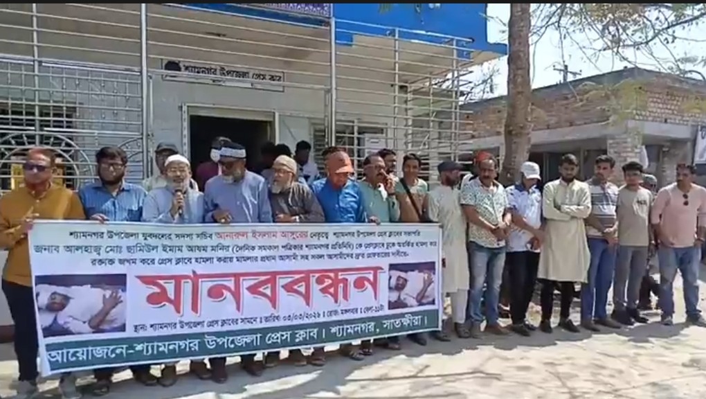 মঙ্গলবার (৩ মার্চ) বেলা ১১টায় উপজেলা প্রেসক্লাব চত্বরে শ্যামনগর উপজেলা প্রেসক্লাব ও শ্যামনগর সাংবাদিক সমাজের যৌথ উদ্যোগে এ মানববন্ধন অনুষ্ঠিত হয়। উপজেলা প্রেসক্লাবের সহযোগী সদস্য আব্দুল আহাদের সঞ্চালনায় আয়োজিত কর্মসূচিতে বিভিন্ন সাংবাদিক সংগঠনের নেতৃবৃন্দ বক্তব্য রাখেন।