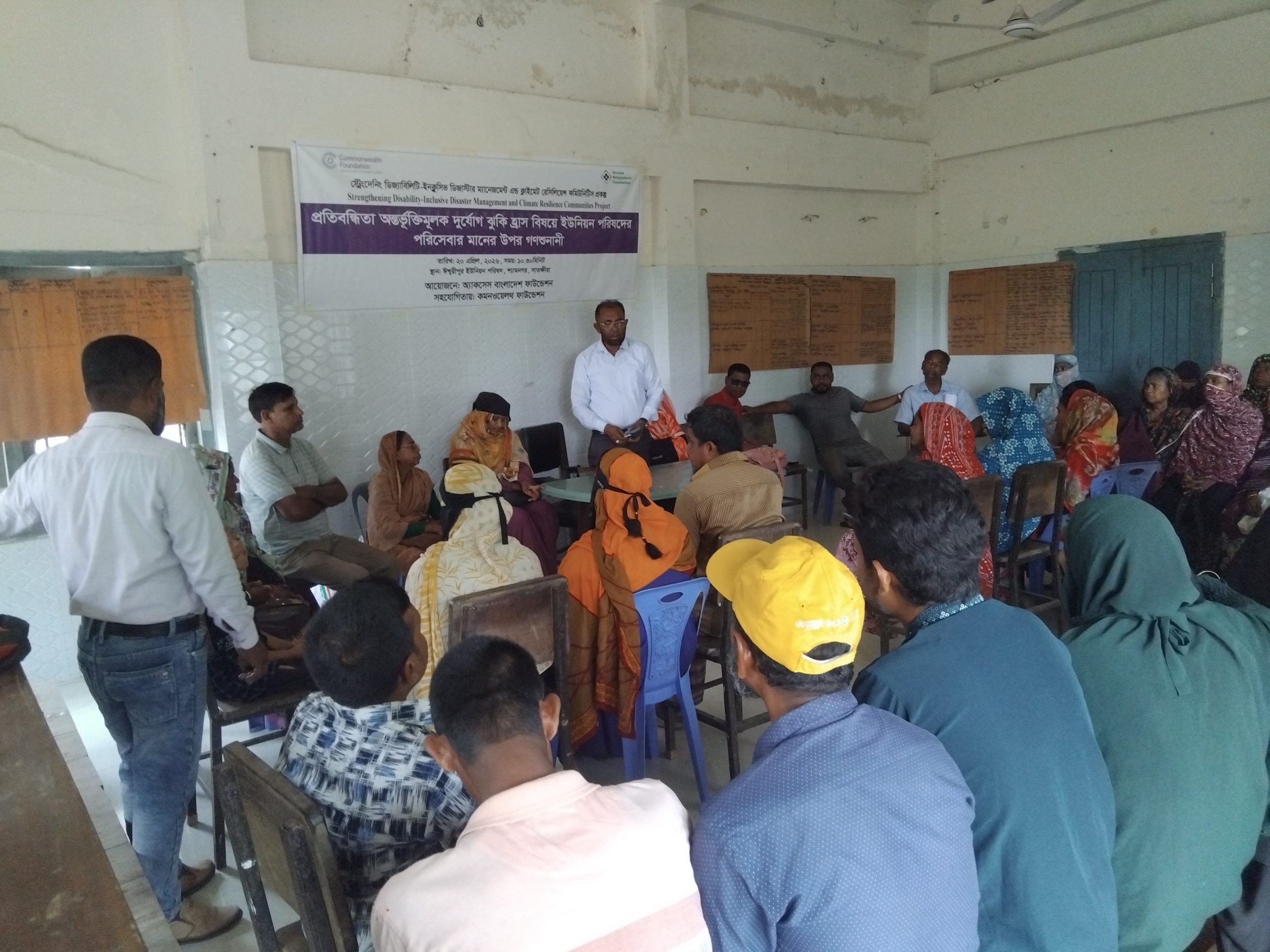 সাতক্ষীরার শ্যামনগরে প্রতিবন্ধিতা অন্তর্ভুক্তিমূলক দুর্যোগ ঝুঁকি হ্রাস বিষয়ে ইউনিয়ন পরিষদের সেবার মান উন্নয়নে গণশুনানী সভা ২০ এপ্রিল ২০২৬ সোমবার সকাল ১০:৩০ ঘটিকায় ইশ্বরীপুর ইউনিয়ন পরিষদের হলরুমে কমনওয়েলথ ফাউন্ডেশনের আর্থিক সহযোগিতায় বাস্তবায়িত ‘স্ট্রেন্দেনিং ডিজাবিলিটি ইনক্লুসিভ ডিজাস্টার ম্যানেজমেন্ট অ্যান্ড ক্লাইমেট রেজিলিয়েন্স কমিউনিটিস’ প্রকল্পের আওতায় অ্যাকসেস বাংলাদেশ ফাউন্ডেশনের আয়োজনে অনুষ্ঠিত হয়।