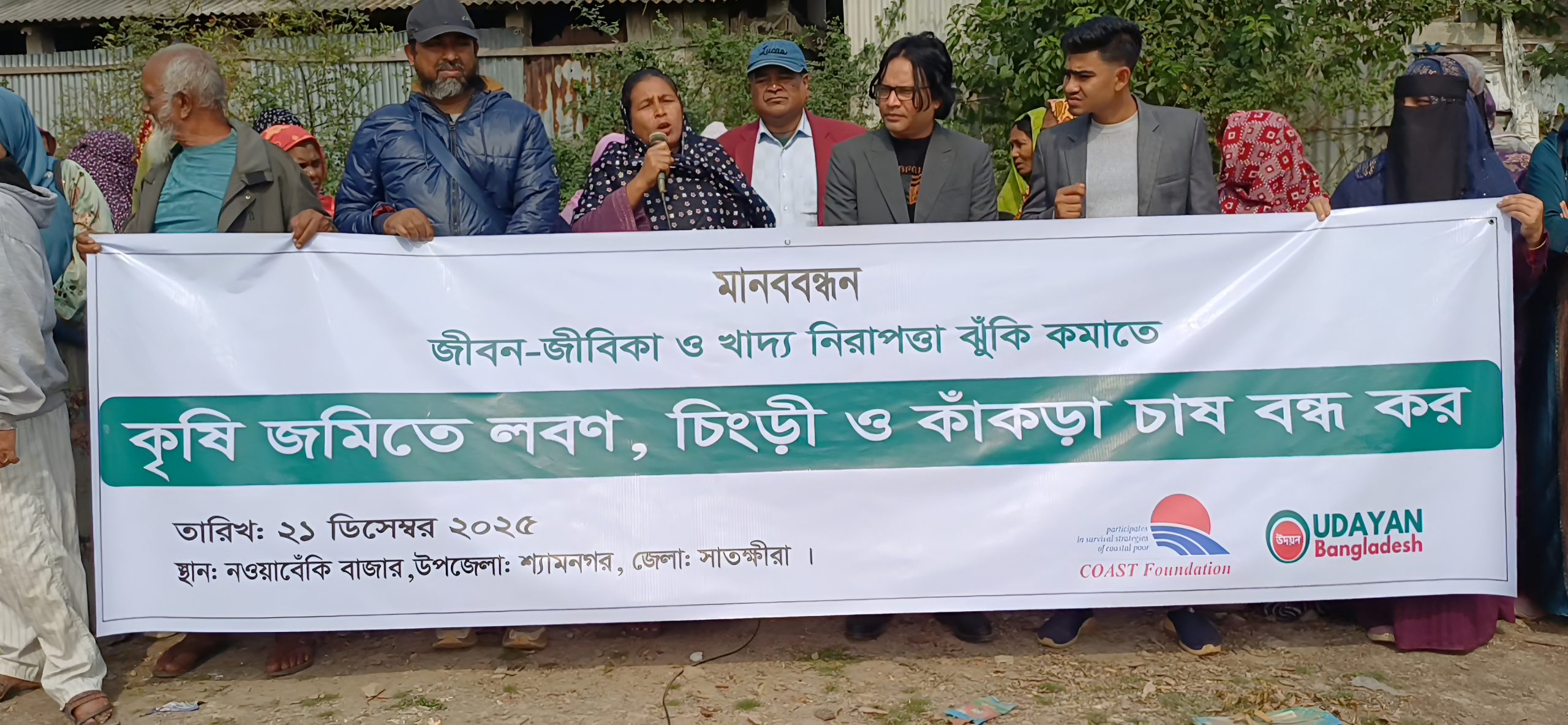 মানববন্ধনে অংশ নেয়া নারীরা বলেন কৃষি জমিতে লবনাক্ত পানি প্রবেশ করিয়ে চিংড়ি ও কাঁকড়া চাষের ফলে ফসলি জমি নষ্ট হচ্ছে, মার্টি উর্বরতা হারাচ্ছে। যা স্থানীয় মানুষের জীবন-জীবিকা মারাত্বকভাবে ক্ষতিগ্রস্থ করছে। যার প্রেক্ষিতে খাদ্য উৎপাদন হ্রাস পাচ্ছে এবং কৃষি নির্ভর জনগোষ্ঠী দীর্ঘেিময়াদী ঝুঁকির মুখে পড়ছে। তাই জীবন-জীবিকা ও খাদ্য নিরাপত্তা নিশ্চিতে কৃষি জমিতে লবন, কাঁকড়া ও চিংড়ি চাষ বন্ধ করা জরুরী। প্রয়োজনে সেজন্য কার্যকর আইন প্রনয়নসহ ক্ষতিগ্রস্থদের বিকল্প আয় ও টুনর্বাসন নিশ্চিত করতে হবে। স্থানীয় জনগোষ্ঠীর সম্মতি ছাড়া ভুমি ব্যবহার পরিবর্তন বন্ধসহ কৃষি ফিরতে হবে।