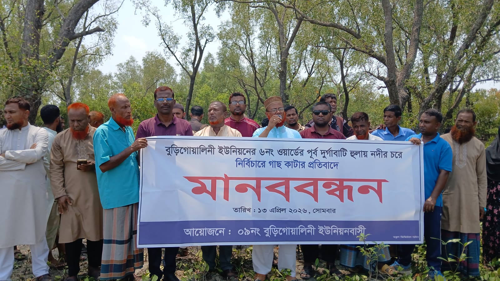 মানববন্ধনে বক্তারা অভিযোগ করেন, সবুজ খাঁন নামের ঠিকাদার, তাহার ম্যানেজার দিয়ে দিনে অথবা রাতে বুড়িগোয়ালিনী ইউনিয়ন সংলগ্ন খোলপাটুয়া নদীর চরে বোলাক বানানোর জন্য মাঠ তৈরি করা জন্য পরিবেশ ধ্বংস করে নির্বিচারে গাছ কেটে মাটি চাপা দিচ্ছে। এতে একদিকে যেমন জীববৈচিত্র্য হুমকির মুখে পড়ছে, অন্যদিকে উপকূলীয় এলাকার প্রাকৃতিক ভারসাম্য নষ্ট হচ্ছে। বিশেষ করে এসব গাছ নদীর চর ও বেড়িবাঁধ রক্ষায় গুরুত্বপূর্ণ ভূমিকা পালন করে বলে তারা উল্লেখ করেন।