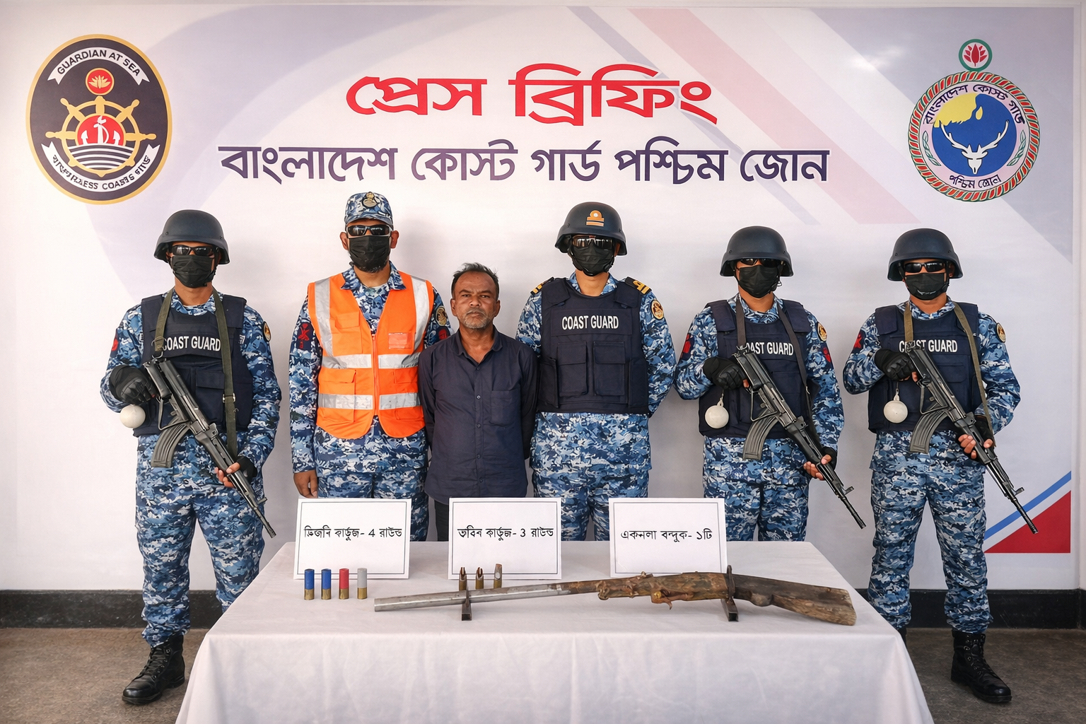 সুন্দরবনে কোস্ট গার্ডের অভিযানে অস্ত্র ও গোলাবারুদসহ কুখ্যাত ডাকাত আসাবুর বাহিনীর প্রধান সহযোগী আটক করেছে।